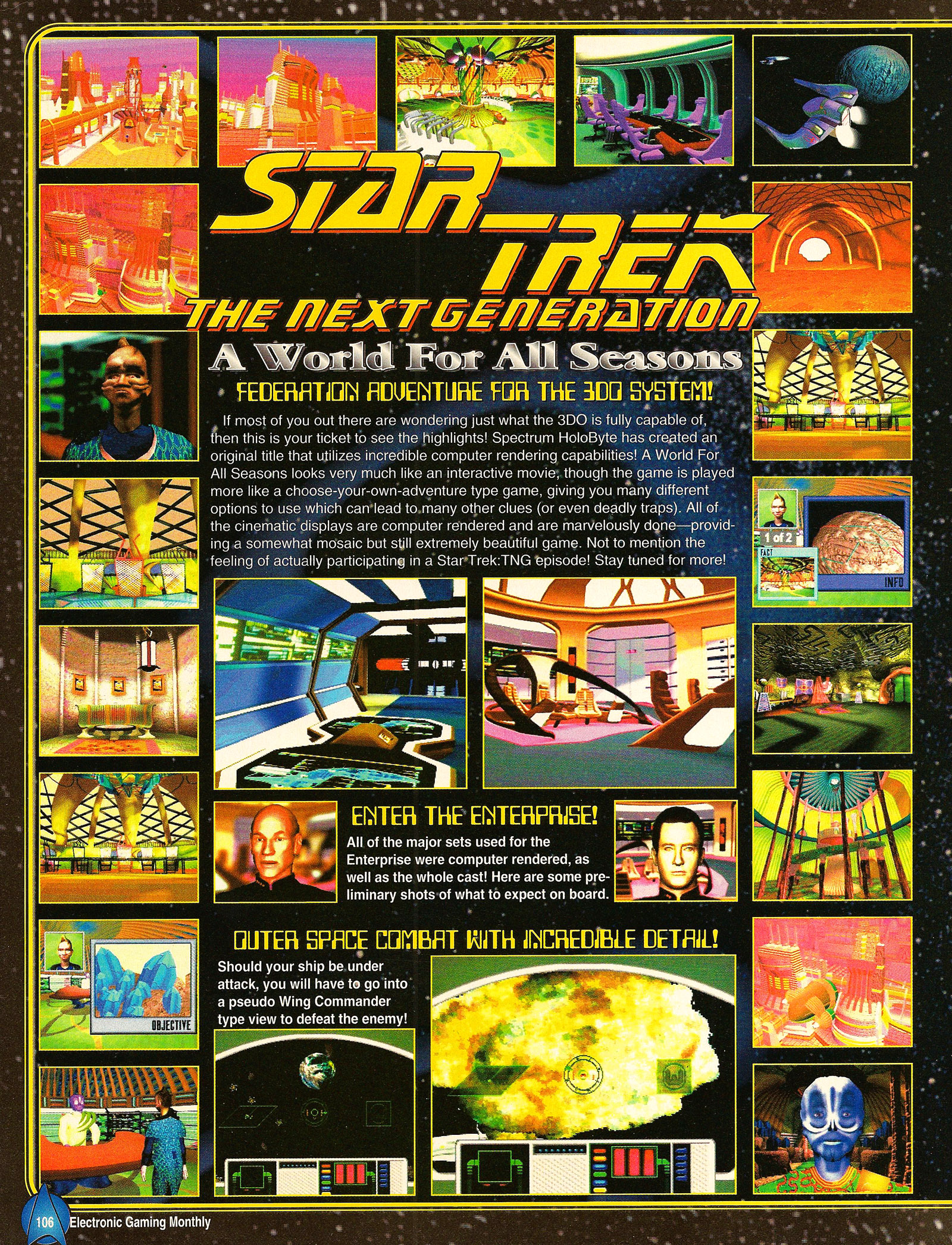 Ages ago in another lifetime (ca. 1994), I was looking forward to a game for the 3DO game console called Star Trek: The Next Generation - A World for All Seasons. Previewed in various magazines of the time, it sparked the imagination with its surprisingly realistic 3D visuals. Games were just transitioning to 3D rendering at this time and this looked unbelievable. Recognizable 3D locations, characters, ships, and more. It seemed photorealistic and you were going to be able to explore all of it! It's not clear how much of the game they could have rendered realtime on the 3DO, which would be the most immersive type of play, but I think it would have been fun and another TNG story to experience.